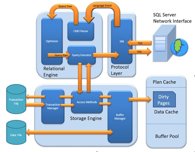 Gambar tersebut menunjukkan arsitektur internal Microsoft SQL Server yang terdiri dari tiga komponen utama, yaitu Protocol Layer, Relational Engine, dan Storage Engine. Pertama kali perintah diterima oleh Protocol Layer. Pada komponen ini ditentukan language event dari perintah. Selanjutnya dipilah mana yang perlu diteruskan ke Relational Engine dan mana yang langsung dikembalikan. Perintah yang diteruskan ke Relational Engine kemudian dianalisis apakah perlu diteruskan ke Storage Engine atau tidak. Untuk data yang perlu diteruskan ke Storage Engine akan dilakukan analisa mengenai Access Method yang dipakai. Jika merupakan perintah yang berkaitan dengan perubahan data akan diteruskan ke Transaction Manager untuk mencatat log perubahan. Sedangkan untuk perintah yang tidak melibatkan perubahan data akan dilakukan pengecekan ke Buffer Manager apakah data yang diminta sudah ada. Jika data yang diminta belum ada maka dilakukan akses ke file fisik. Selanjutnya hasil perintah dikembalikan ke Relational Engine untuk selanjutnya diteruskan ke Protocol Layer.